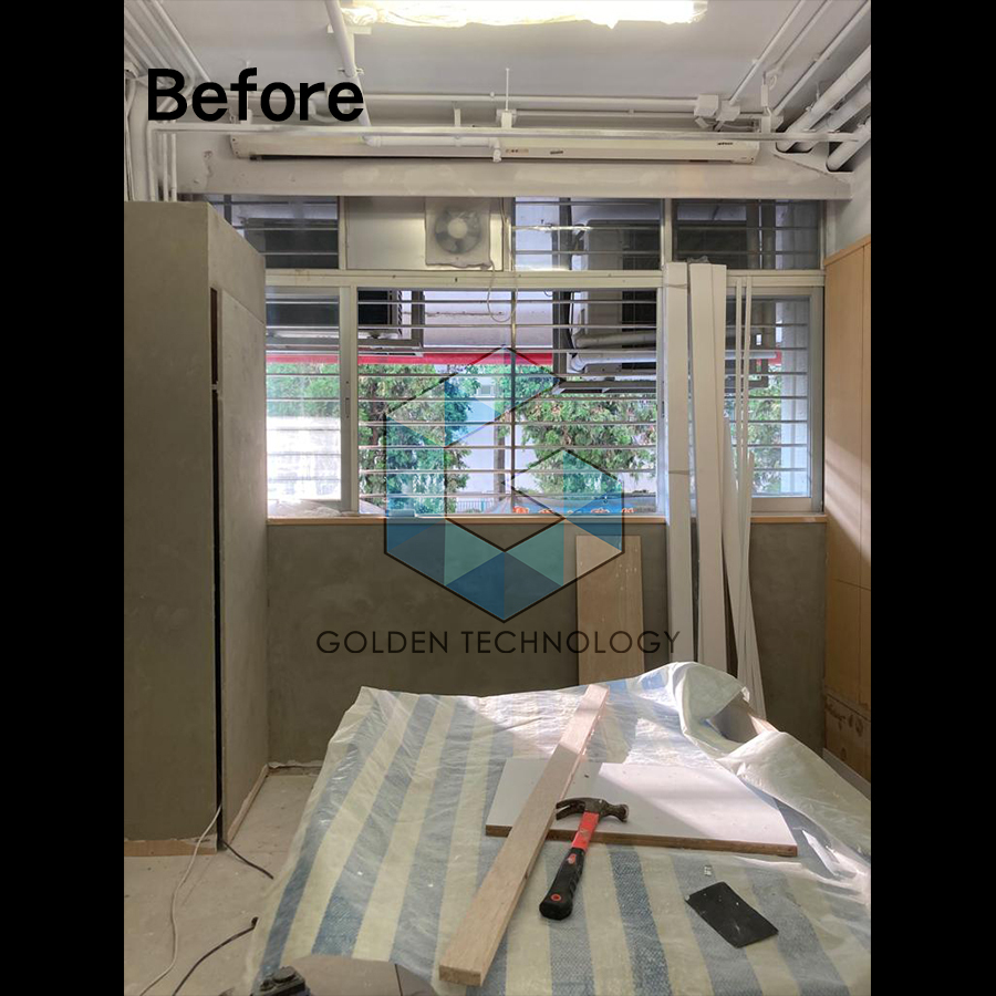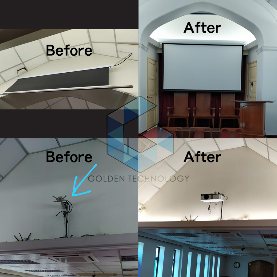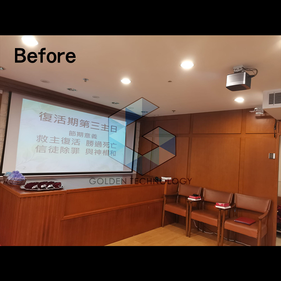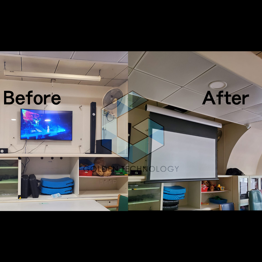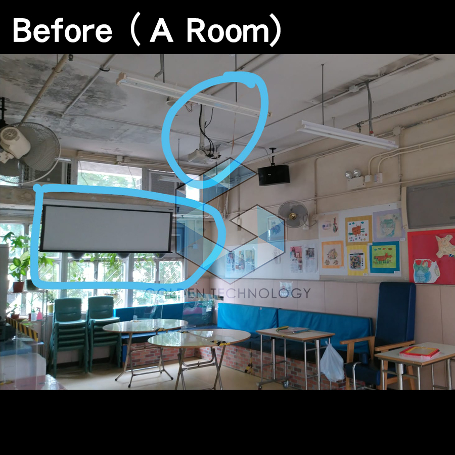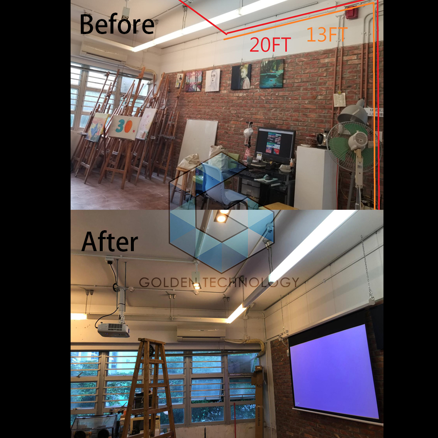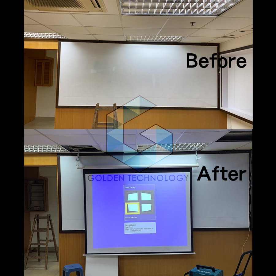 安裝內容: 拆除舊有投影機,投影幕, 安裝新投影機, 投影屏幕接駁電源,拉設8m訊號線, 於牆身做接駁面板, 投影幕牆身開關