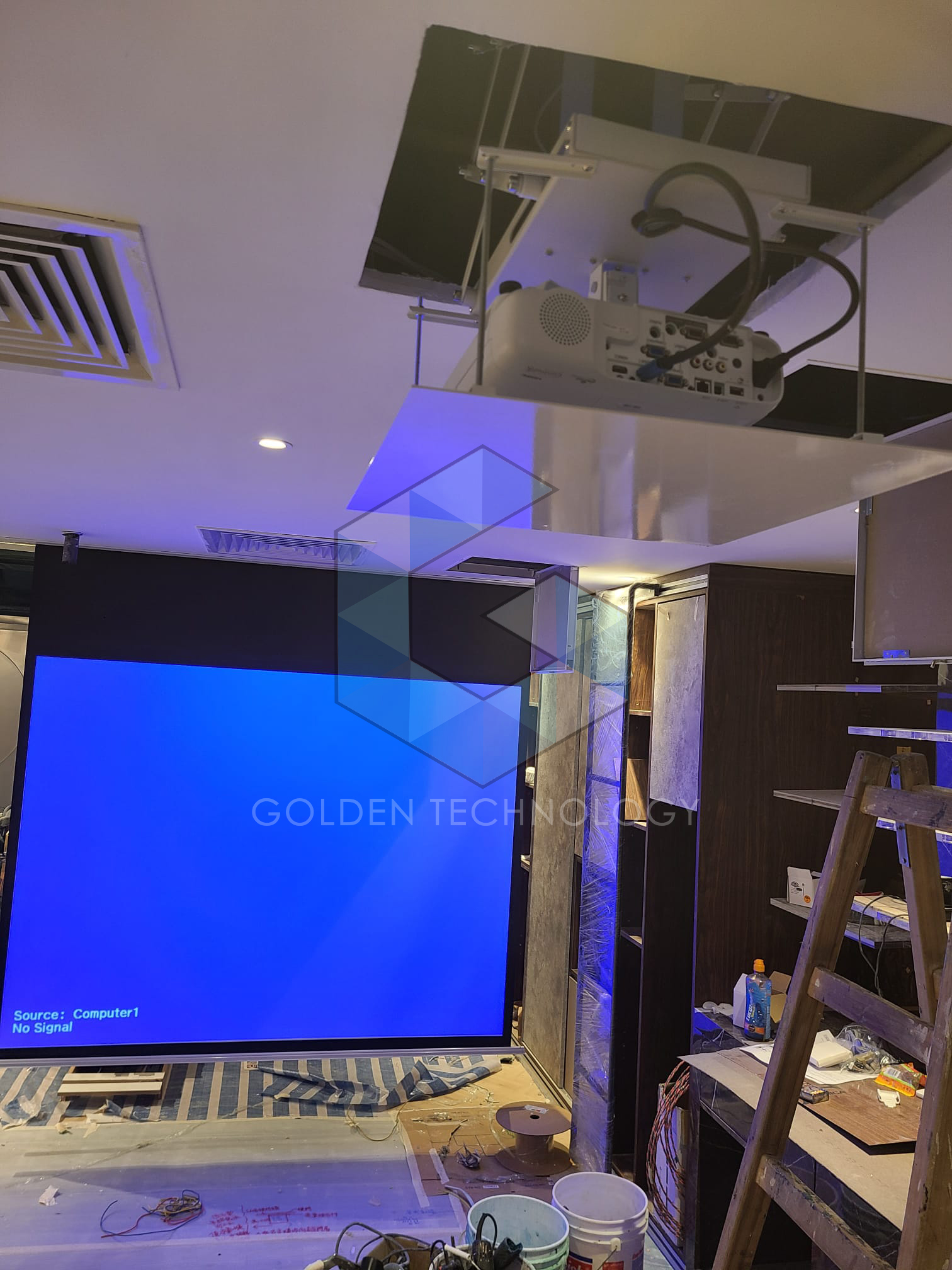 安裝內容:安裝一支電動幕,一個吊架,一部投影機,並拉電源線和HDMI訊號線,並於牆身造面板,外露位置使用膠喉.