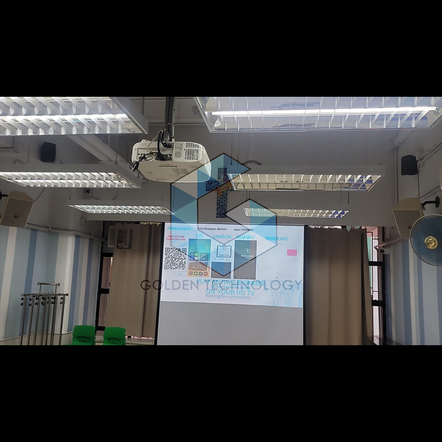 安裝內容:使用現場原有投影機吊架,更換投影機,於天花吊裝投影幕,接駁電源,並於電源附近安裝投影幕無線遙控面板.