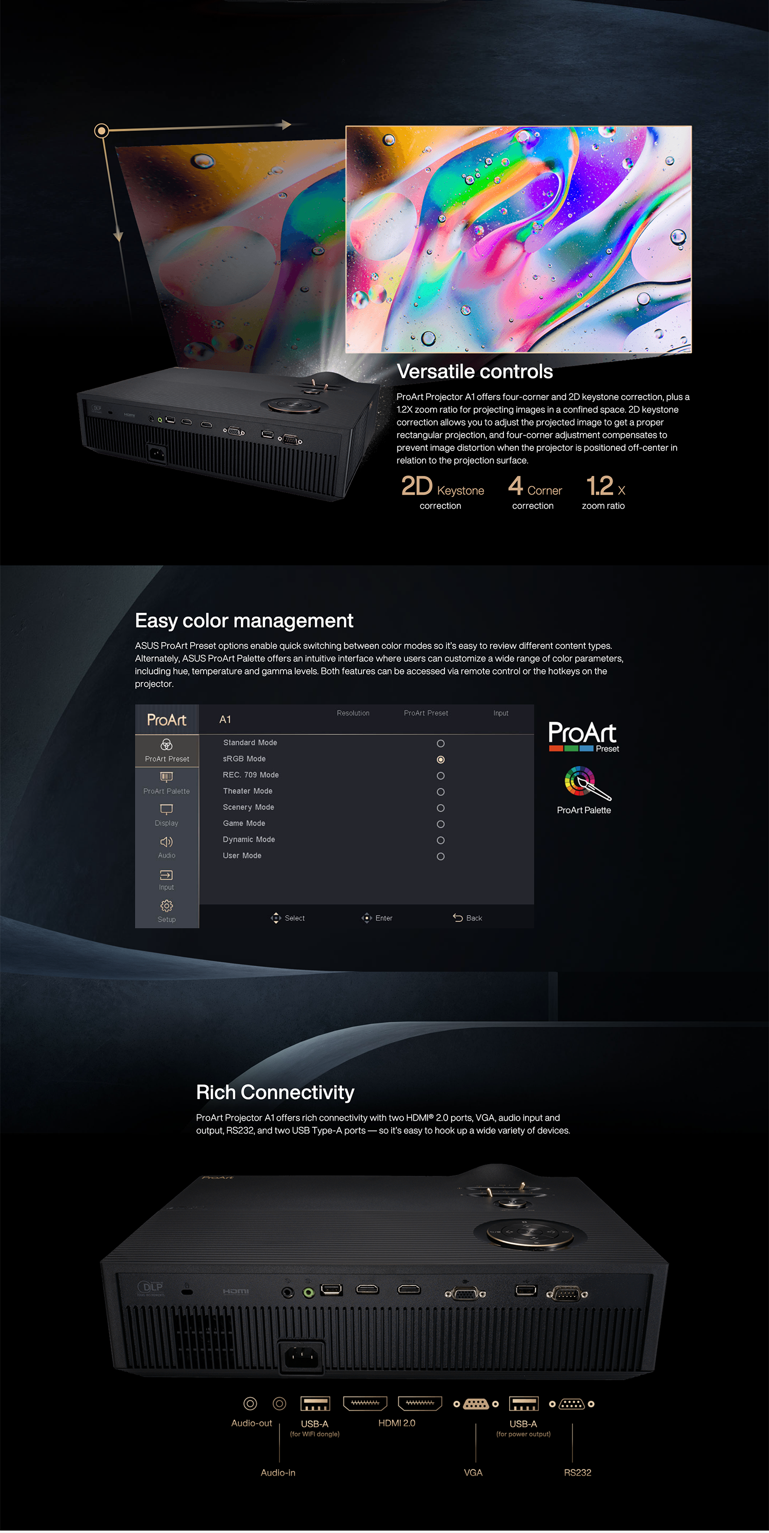 ASUS ProArt A1 LED professional projector- World’s first Calman Verified projector,∆ E < 2, 98% sRGB and Rec. 709, FHD (1920 x 1080), 3000 lumens, Four corner and 2D keystone correction, 1.2X zoom ratio, wireless mirroring