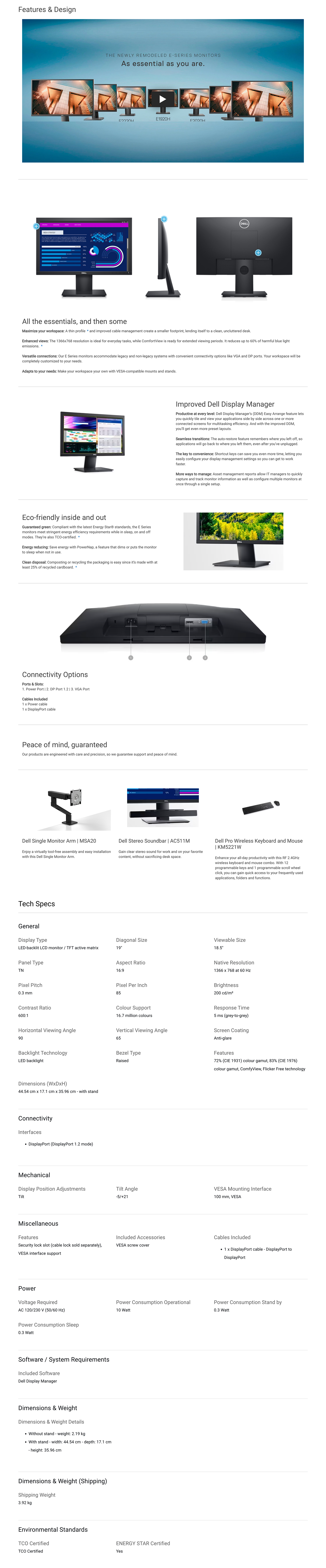 An affordable 18.5" monitor made for your daily workflow. Featuring an elegant design, 1366x768 resolution and Dell Display Manager.
