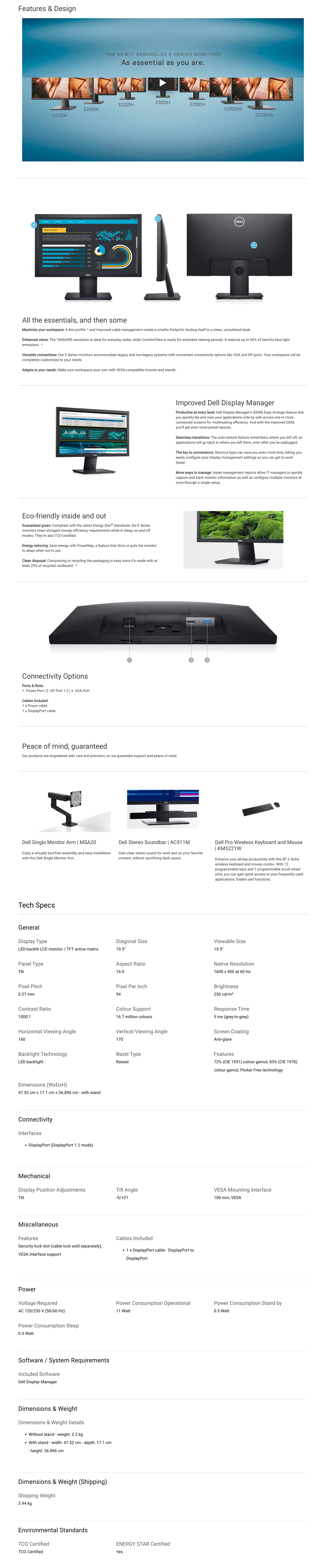 An accessible 19.5" monitor made for your daily workflow. Featuring an elegant design, 1600x900 resolution and Dell Display Manager.