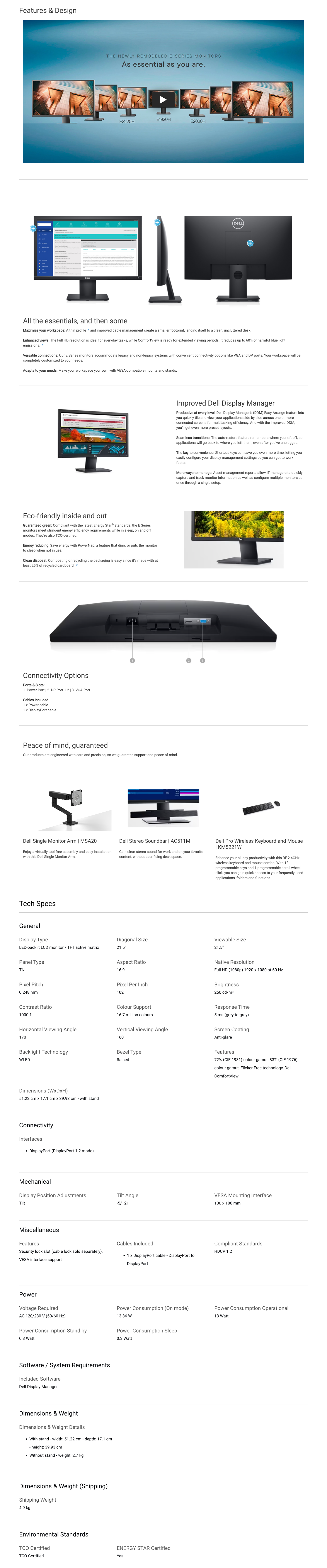 An accessible 21.5" monitor made for your daily workflow. Featuring an elegant design, Full HD resolution and Dell Display Manager.