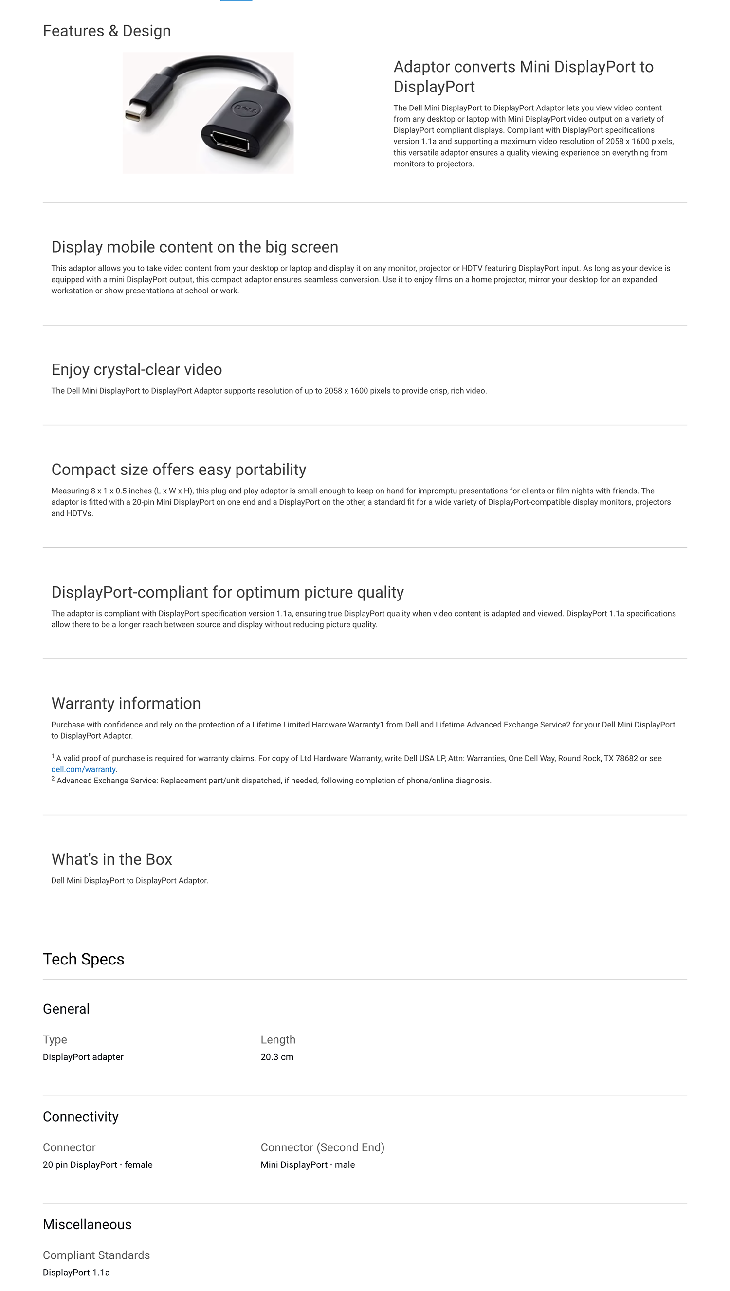 The Mini DisplayPort to DisplayPort Adapter from Dell™ lets you view video content from any desktop or laptop with Mini DisplayPort video output on a variety of DisplayPort compliant displays.