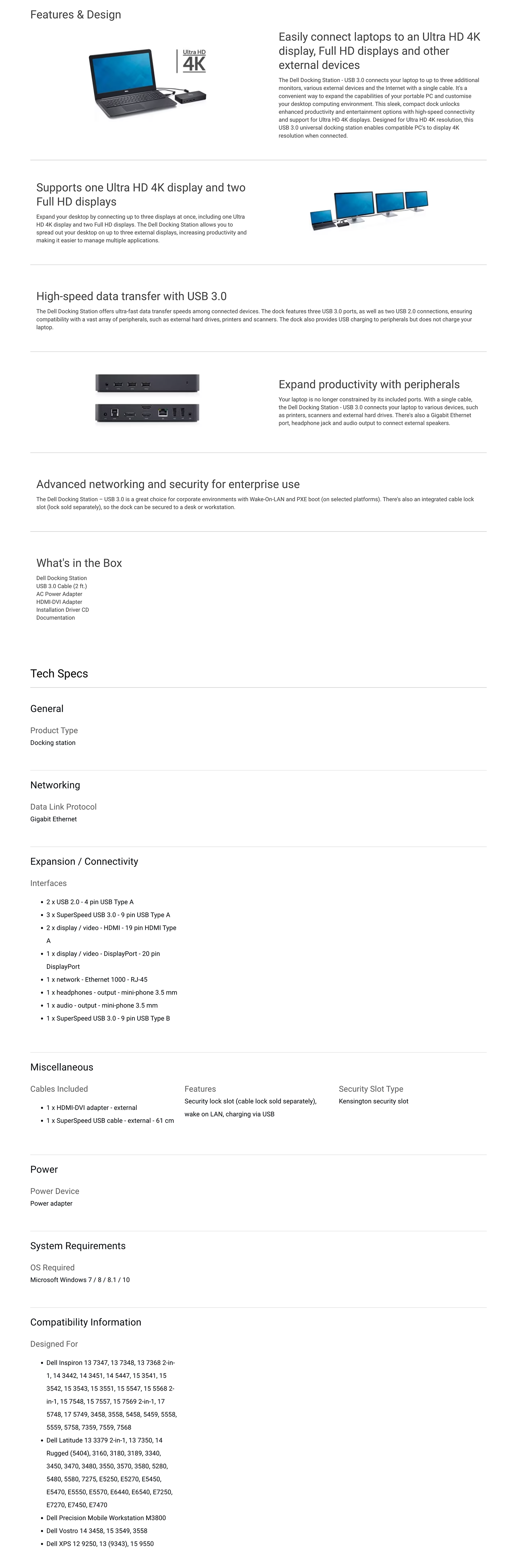 The Dell™ Docking Station – USB 3.0 connects your laptop to up to three additional monitors, various external devices and the Internet with a single cable. The dock provides USB charging to peripherals but does not charge your laptop.