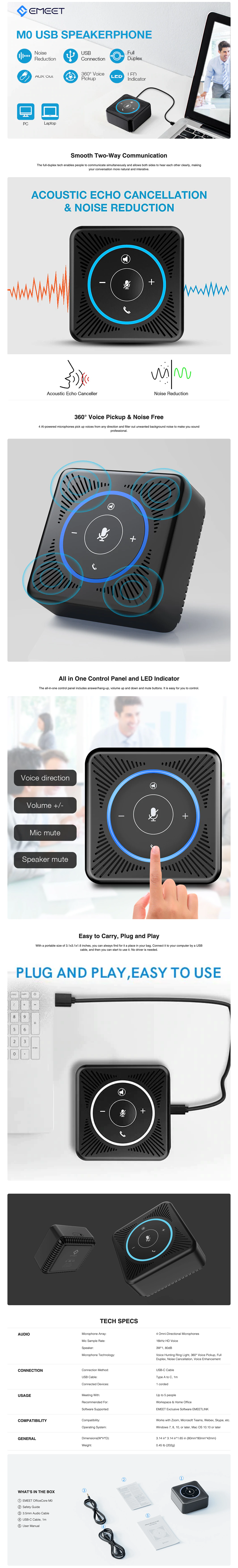 EMEET M0是一款USB 全向麥克風,有著完善1算法+2技術的全降噪技術,精緻小巧僅200g,USB隨插即用零延遲,讓你隨時隨地享受高品質WFH , 遠距教學的通話效果。
