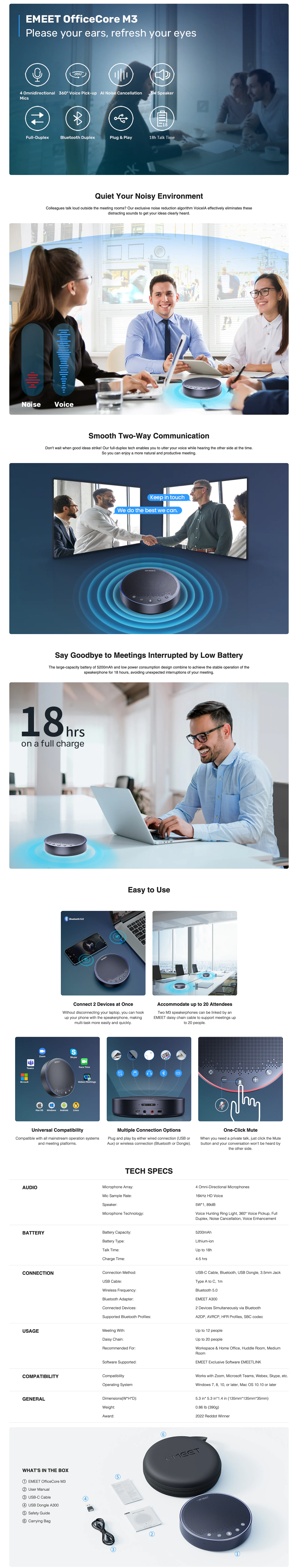 EMEET M3 is an ideal bluetooth speakerphone for home offices and group meetings that removes background noise and keeps your voice crystal clear. It works for 18 hours on a single charge.