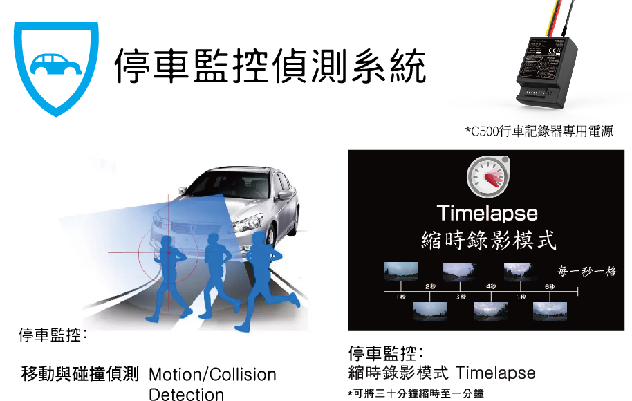 想透過 f400 監控車輛停置時的狀況,可啟用24小時停車錄影、移動及碰撞偵測、或縮時錄影等功能。停車監控系統需要配合 “C500行車記錄器專用電源”,透過可調式低壓電保護機制及監控時間,能自動斷電確保車輛能點火啟動。