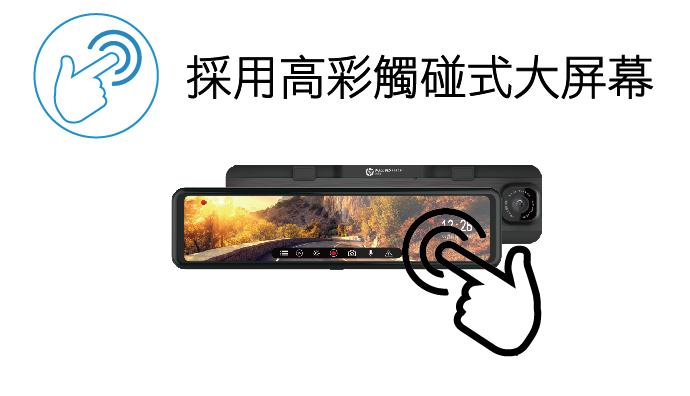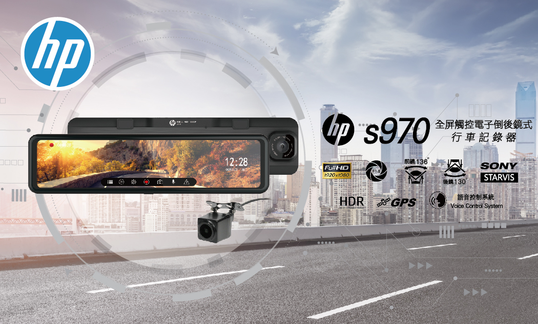 HP s970 配備12英寸觸控屏,在大尺寸的螢幕上查看錄影檔案或是後方的即時影像。同時,只需用手指輕輕觸碰螢幕上的功能圖像,即可設定功能、播放錄影檔案、調整螢幕的明暗度、開始/暫停錄影、即時抓拍、開始/停止錄音、啟動緊急錄影鎖定檔案等等功能。