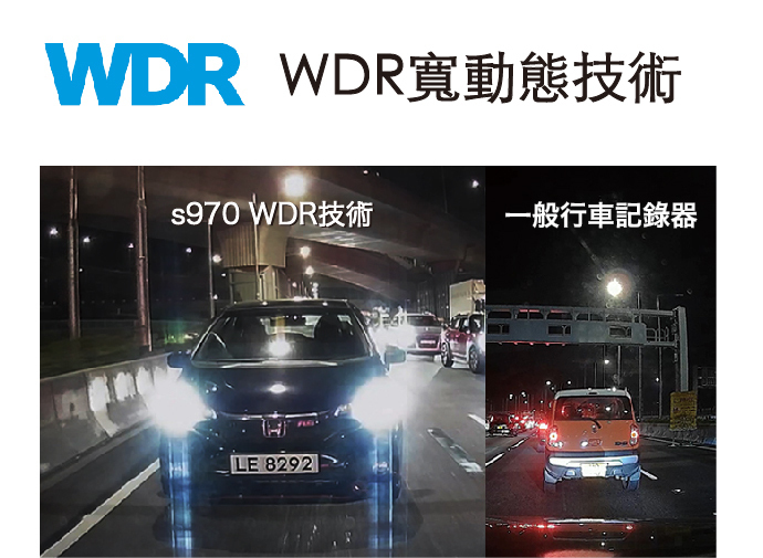 後車的頭燈強光有機會令一般的行車記錄器無法清楚拍下車牌。HP s970 擁有 WDR (Wide Dynamic Range) 測光技術,抑制後車強光,確保就算意外發生時你都可以清楚拍低證據。