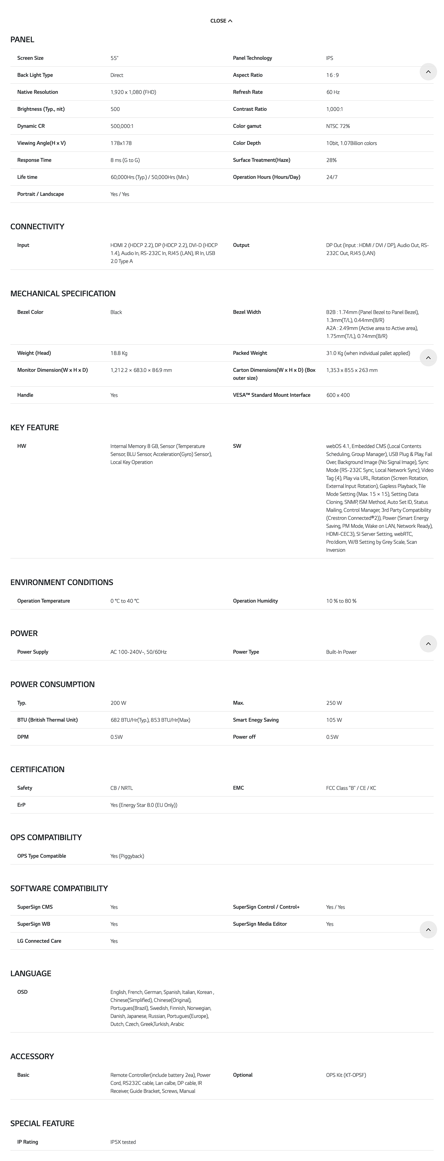 - Interface : HDMI/ DP/ DVI-D/ USB/ RS232C/ RJ45/ Audio/ IR