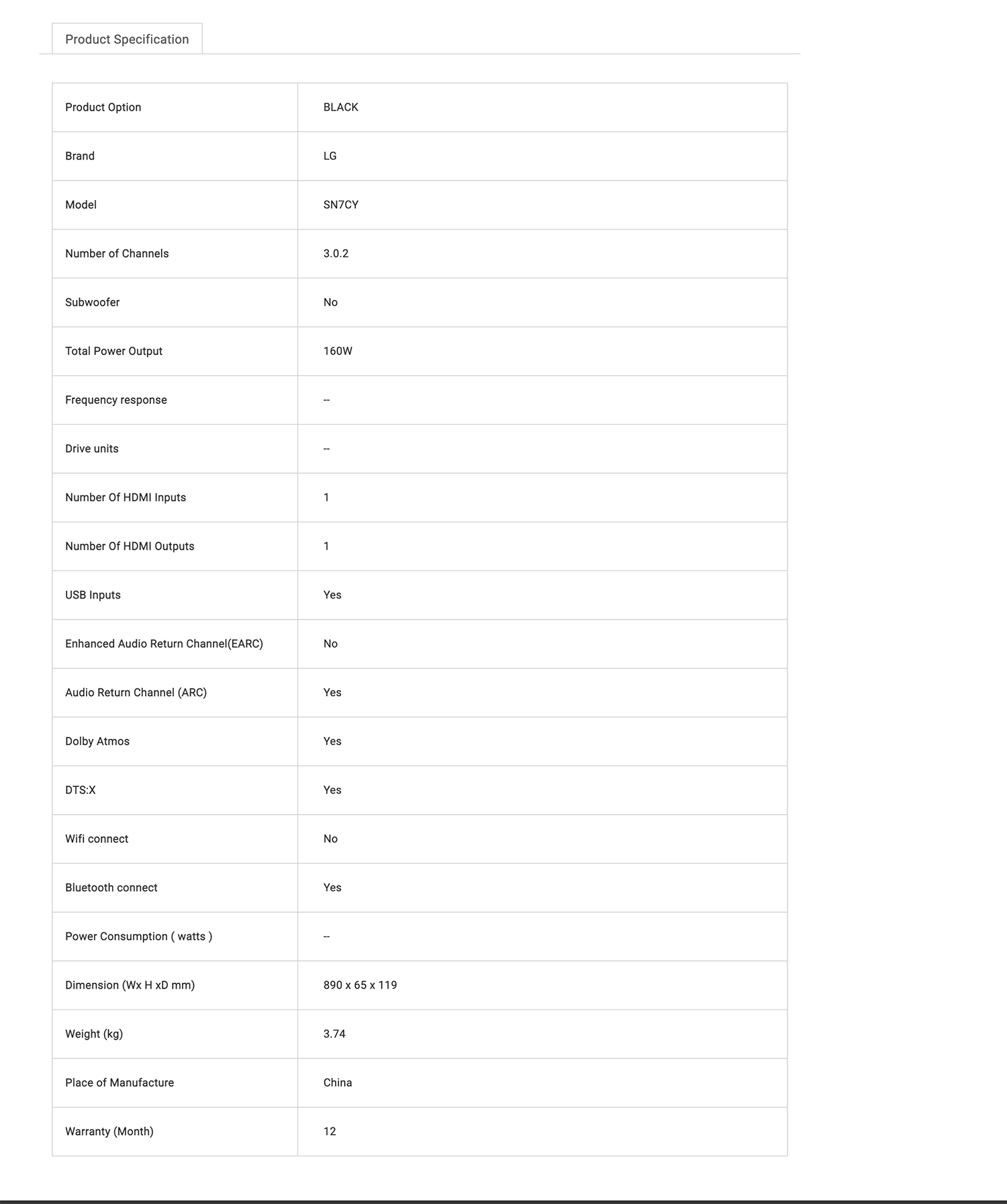 DSP allows absolute control over the audio signal, enabling the design of advanced technologies that can enhance the listening experience in any context.Meridian has been a long-term collaborator and technology partner with Dolby. Meridian Lossless Packing technology is licensed to Dolby as the standard for DVD audio.Meridian developed MQA - the revolutionary technology for efficiently streaming music with the highest possible sound quality.The LG Sound Bar SN7CY meets Dolby Vision™ ,Dolby Atmos® and DTS:X to transform your home into a theater,for the most immersive viewing of all your favorite movies.High Resolution Audio delivers 96kHz sampling rates and 24bit depth, for more accurate sound and a more enjoyable listening experience.