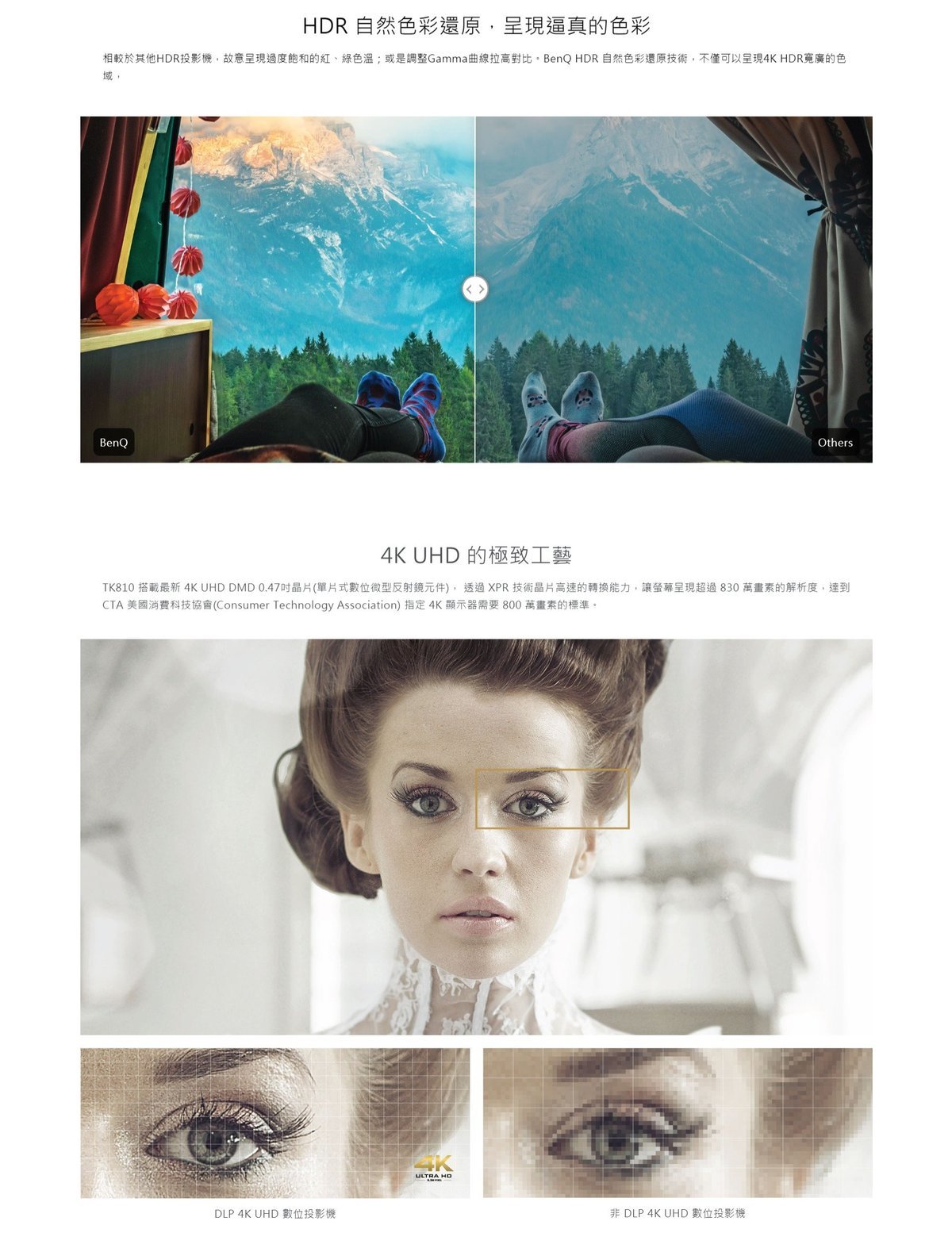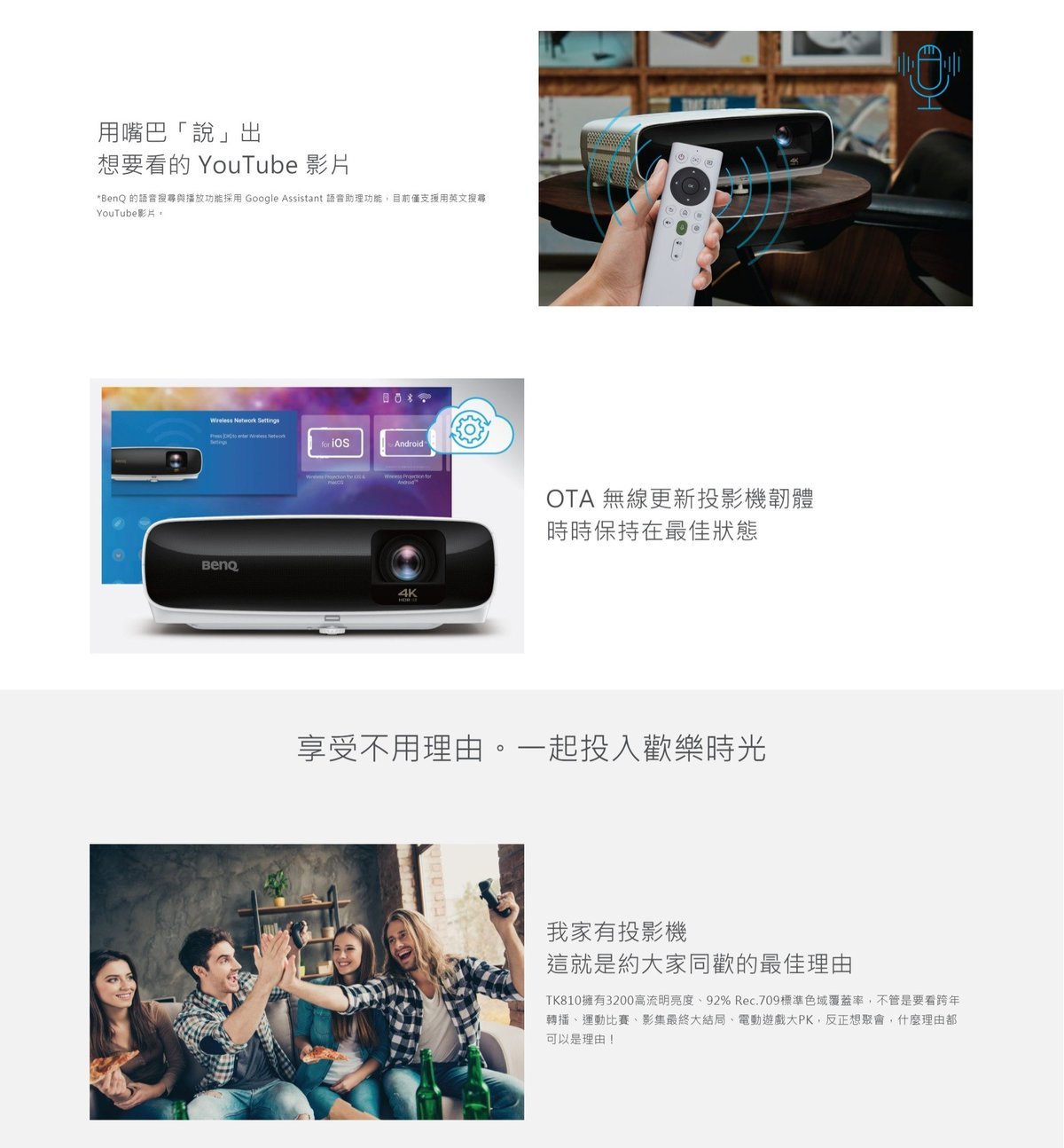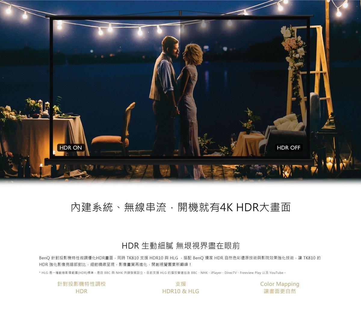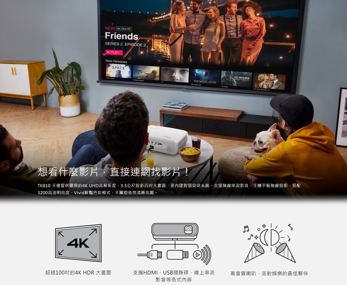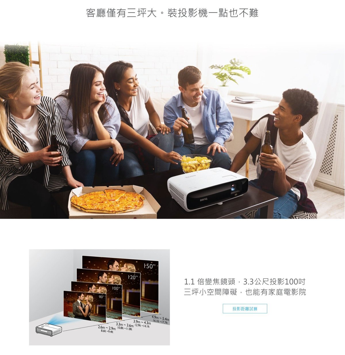 - 3.3公尺投影100吋,3200 高流明亮度,輕鬆投影4K HDR大畫面