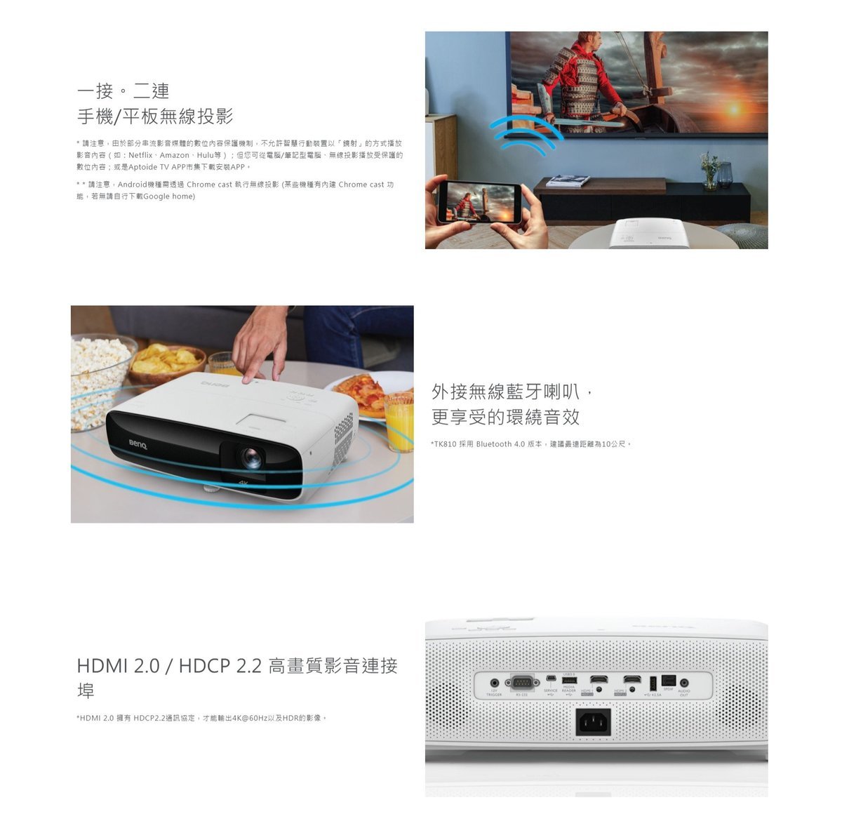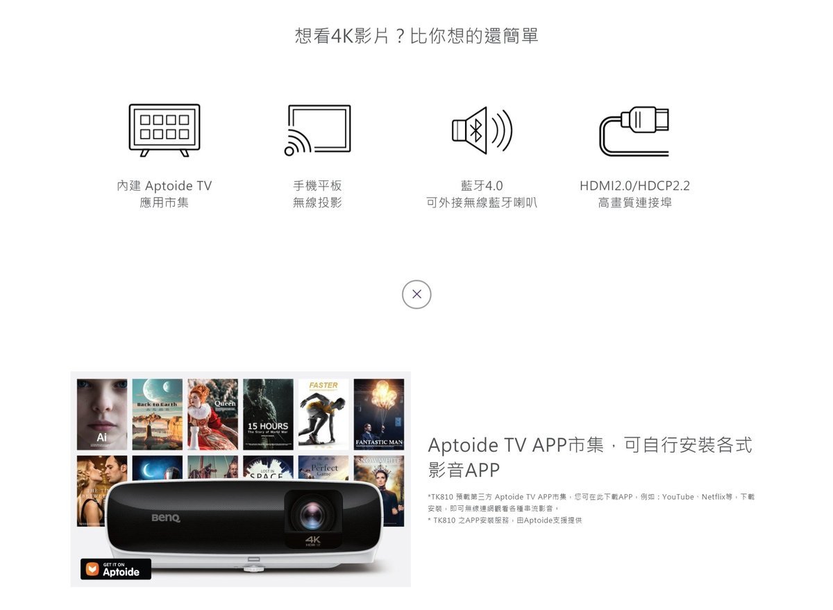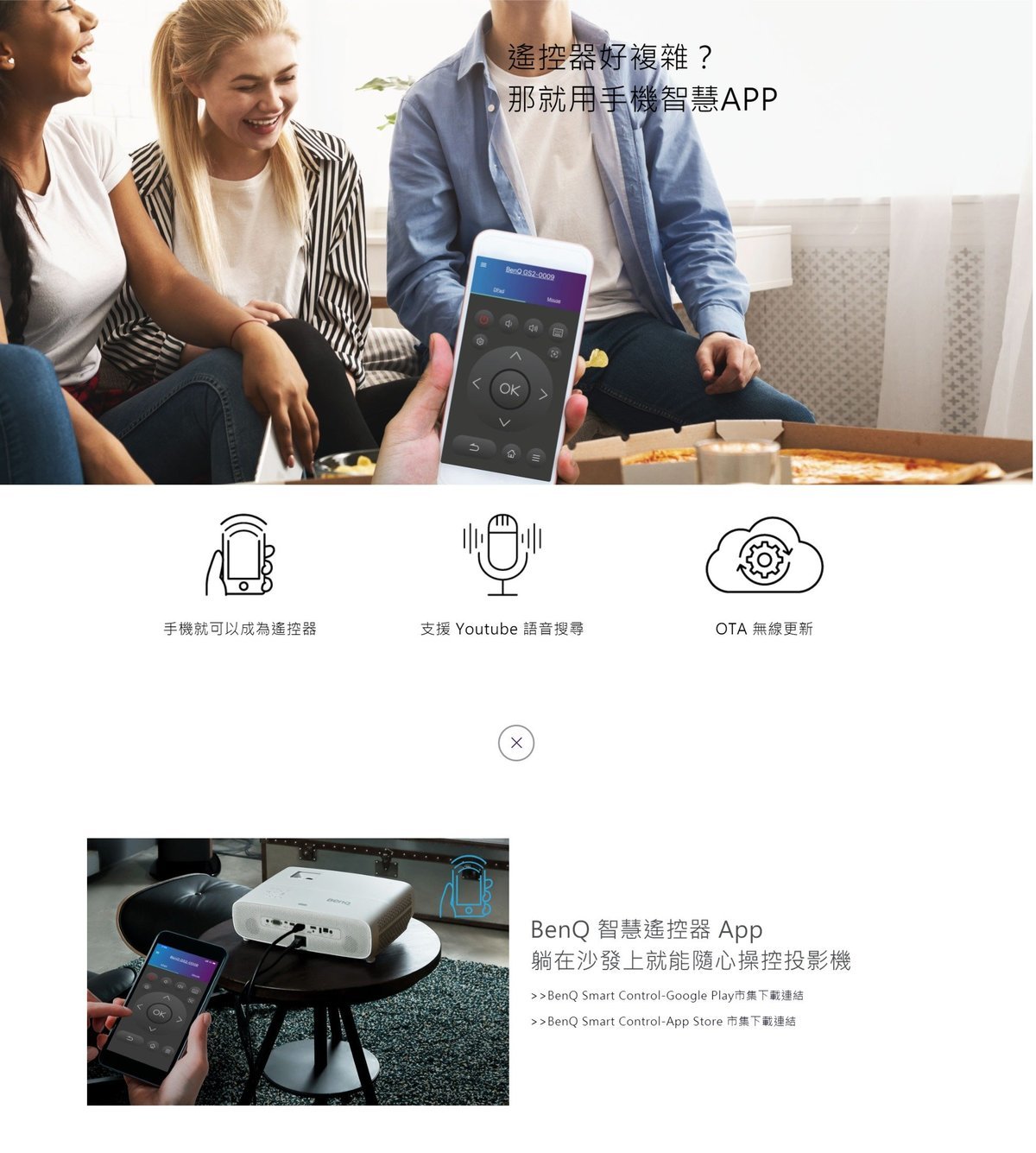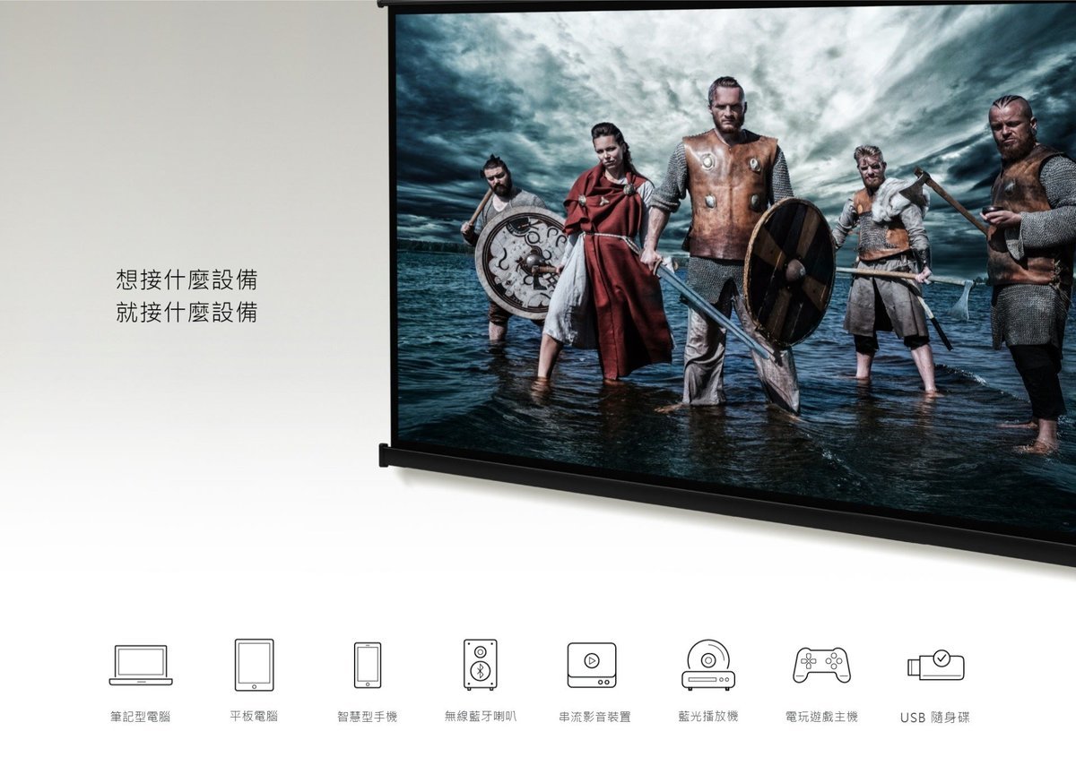 - 支援手機/平板無線投影,內建智慧系統可安裝影音APP