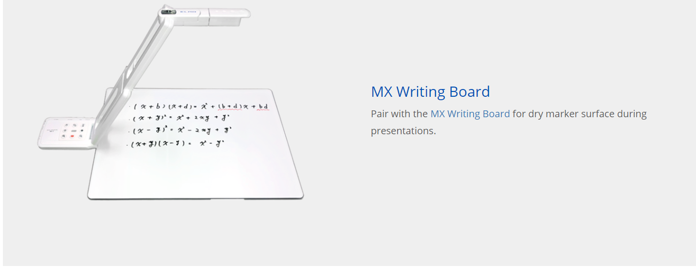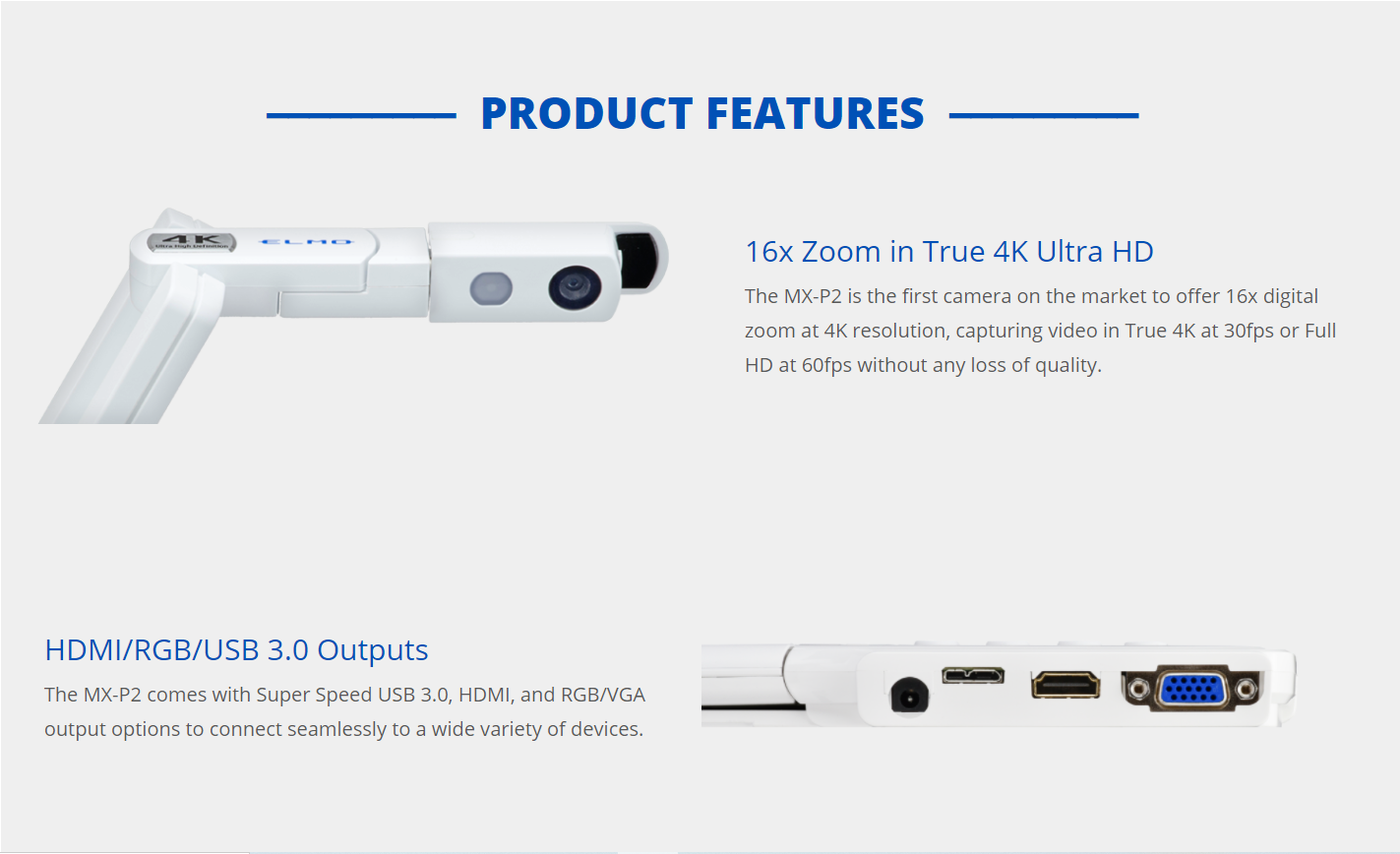 The MX-P2 delivers the smoothesttrue-to-life, high-quality image with no delay. It is the first document cameraon the market capable of 16x digital zoom at 4K resolution. MX-P2 captures true4K at 30fps or full HD at 60fps and comes with a built-in microphone.