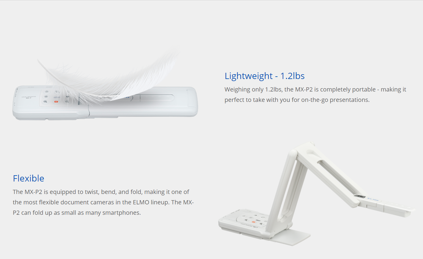Weighing only 1.2lbs, the MX-P2’s flexible structure and easy setup make it the perfect solution for presentations on the go.