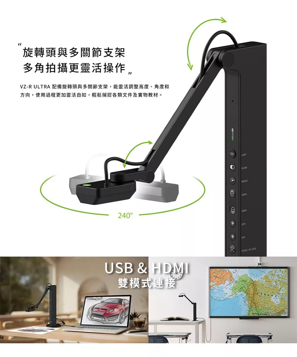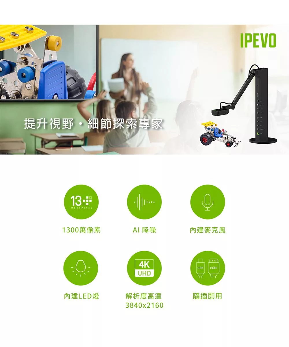 VZ-R ULTRA 13MP 雙模文件攝影機,超高解析度非常適合教室使用,能即時分享教學影像,清晰且細緻地捕捉影像細節,最大可拍攝 A3 大小的教材。此攝影機結合便攜性與穩定性,具備隨插即用的連接功能,能輕鬆與教室設備搭配使用,無需連接電腦,對於教師來說,這款攝影機是一個不可或缺的教學利器