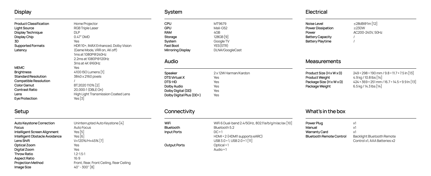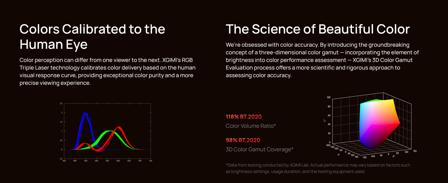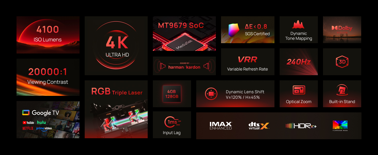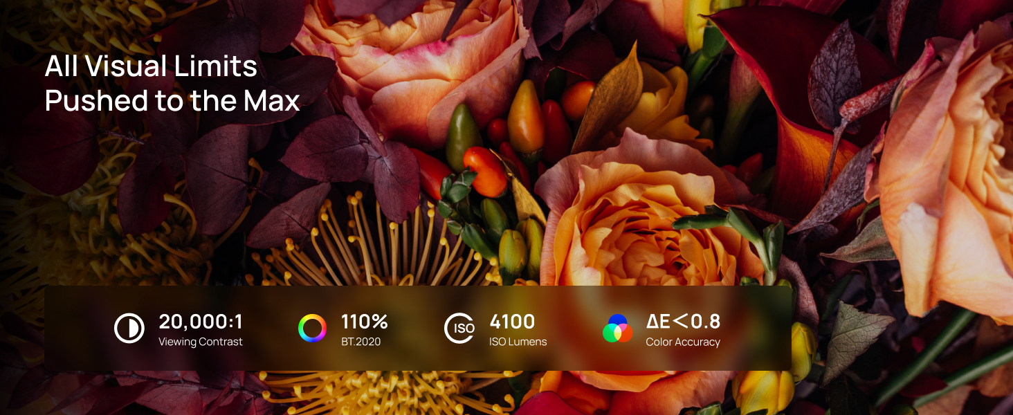 RGB 三重雷射光芒:使用 X-Master RGB 三重雷射引擎深入探索色彩豐富、栩栩如生的視覺效果。 4100 ISO 流明亮度和超深 20,000:1 對比度為每一個場景帶來無與倫比的活力和深度。