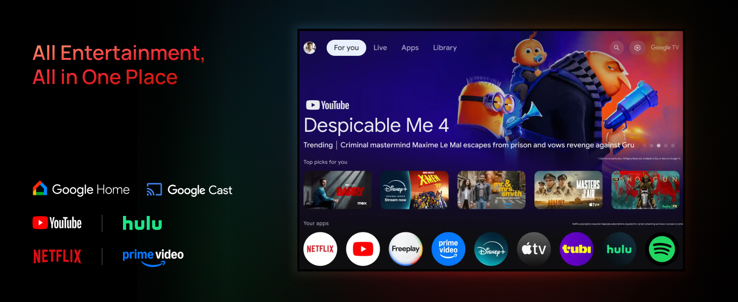 Google,完全整合:內建 Google TV 和 Google Home,享受即時存取串流應用程式和免持語音控制
