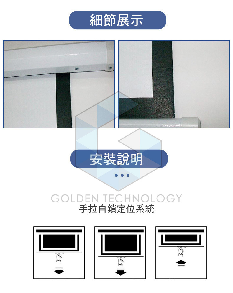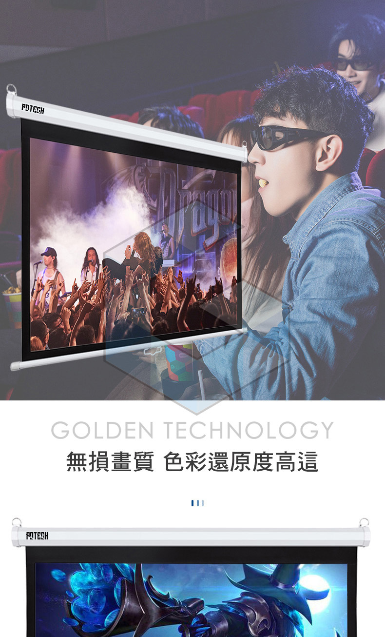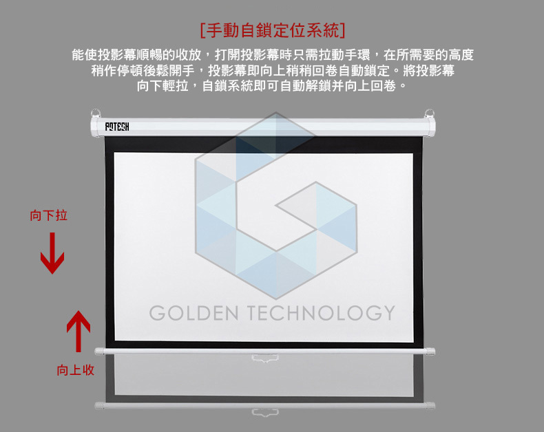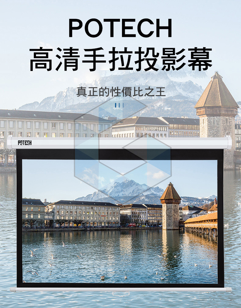 經典系列手動自鎖銀幕採用堅實的八角型合金外殼,典雅氣派,適合任何裝飾環境;。玻珠或白塑和玻纖白幕布,亮度高增益大,令畫面更加清晰艷麗。