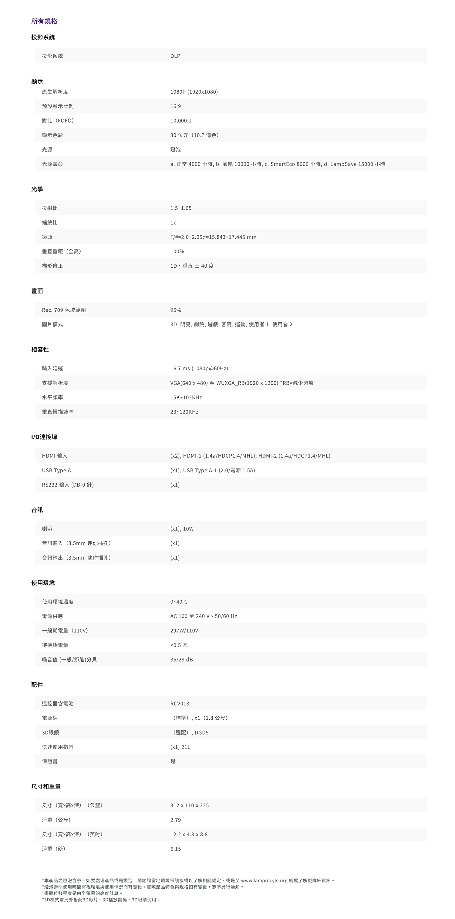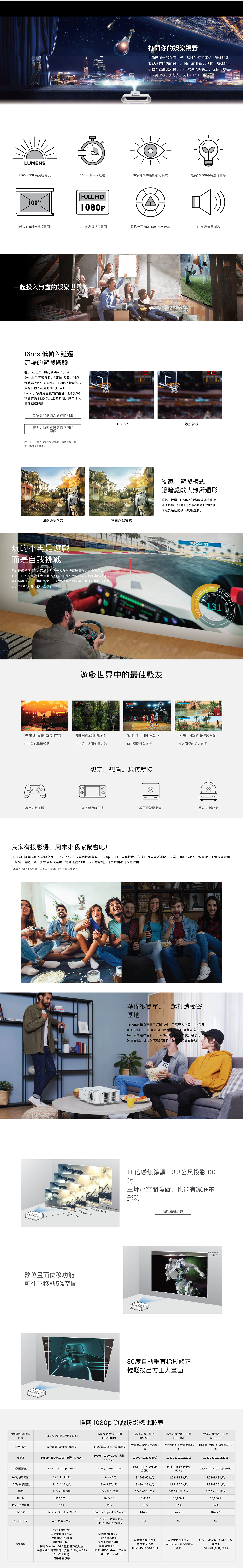 - 3500 高流明亮度,3.3公尺投影100吋大畫面