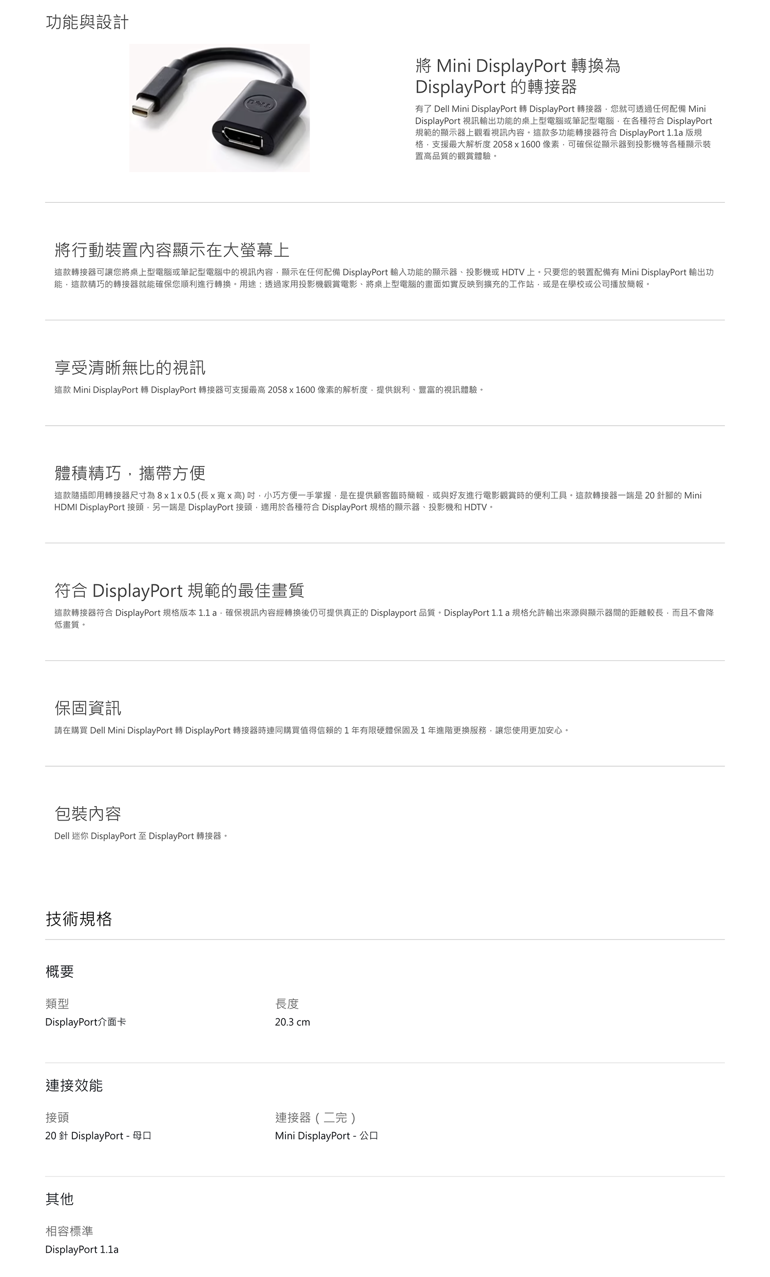 有了 Dell™ Mini DisplayPort 轉 DisplayPort 轉接頭,您就可透過任何配備 Mini DisplayPort 視訊輸出功能的桌上型電腦或筆記型電腦,在各種符合 DisplayPort 規範的顯示器上觀看視訊內容。