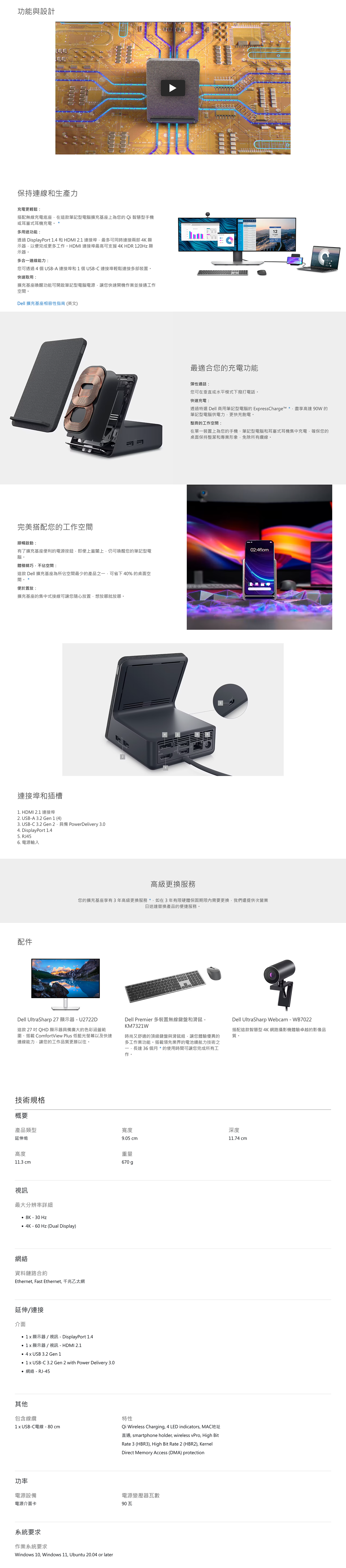 這款精巧型擴充基座具備強大生產力,其為Dell首款配備無線充電底座的筆記型電腦擴充基座,適用於 Qi 智慧型手機或耳塞式耳機。
