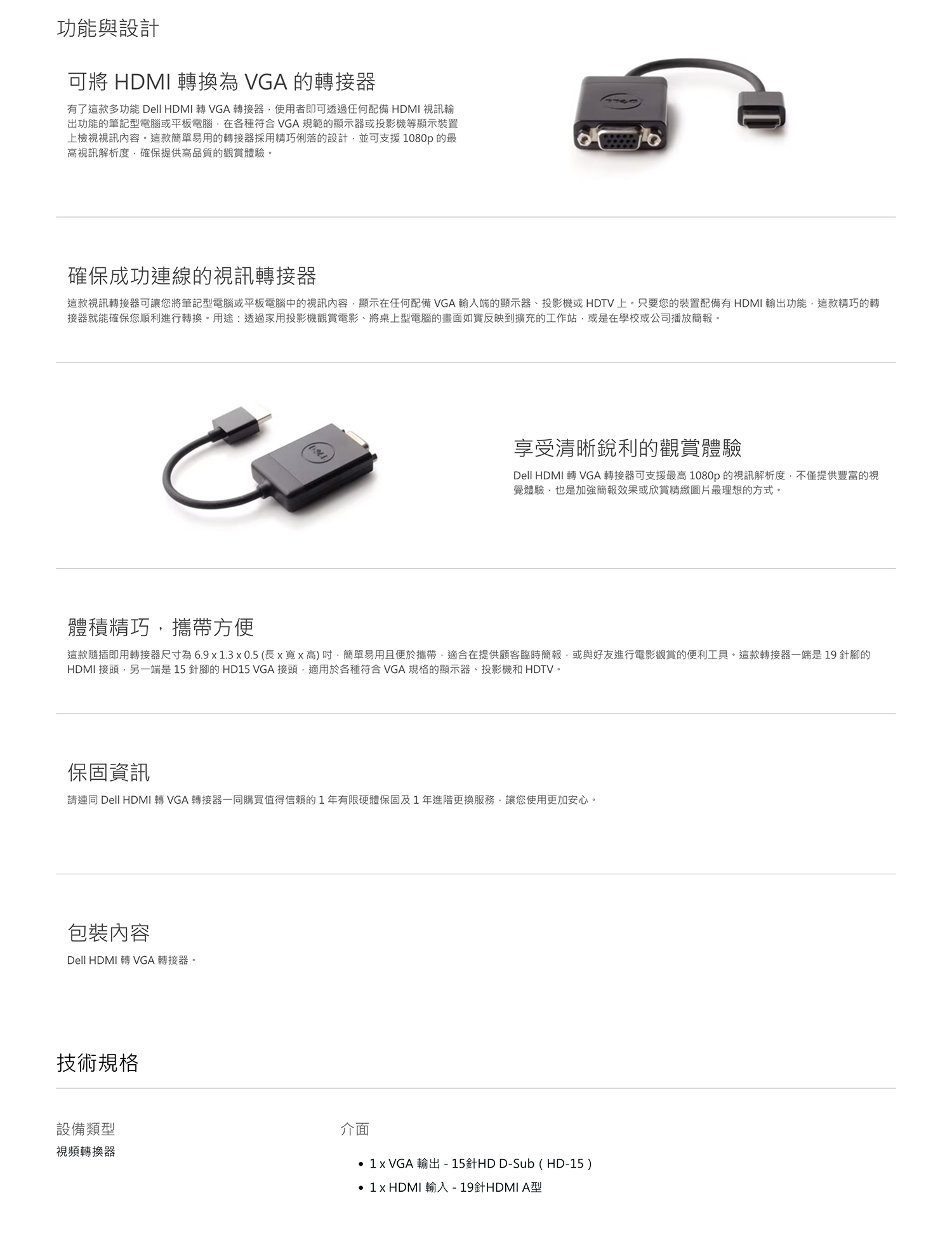Dell HDMI 轉 VGA 轉接器可讓您將筆記型電腦或平板電腦中的視訊內容,顯示在任何配備 VGA 輸入端的顯示器、投影機或 HDTV 上。