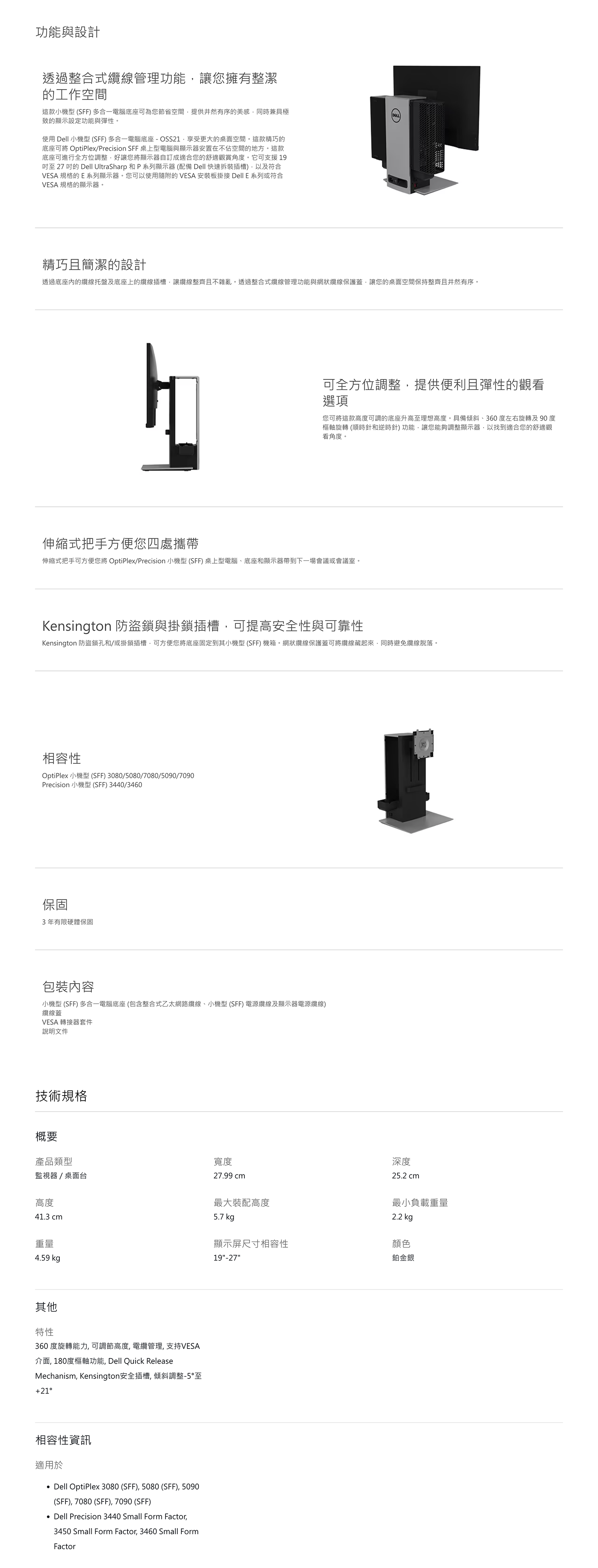 透過精巧的 Dell 小機型 (SFF) 多合一電腦底座 - OSS21,將您的 OptiPlex/Precision 小機型 (SFF) 桌上型電腦和 Dell 顯示器整齊且穩固地安置在您的桌面上。