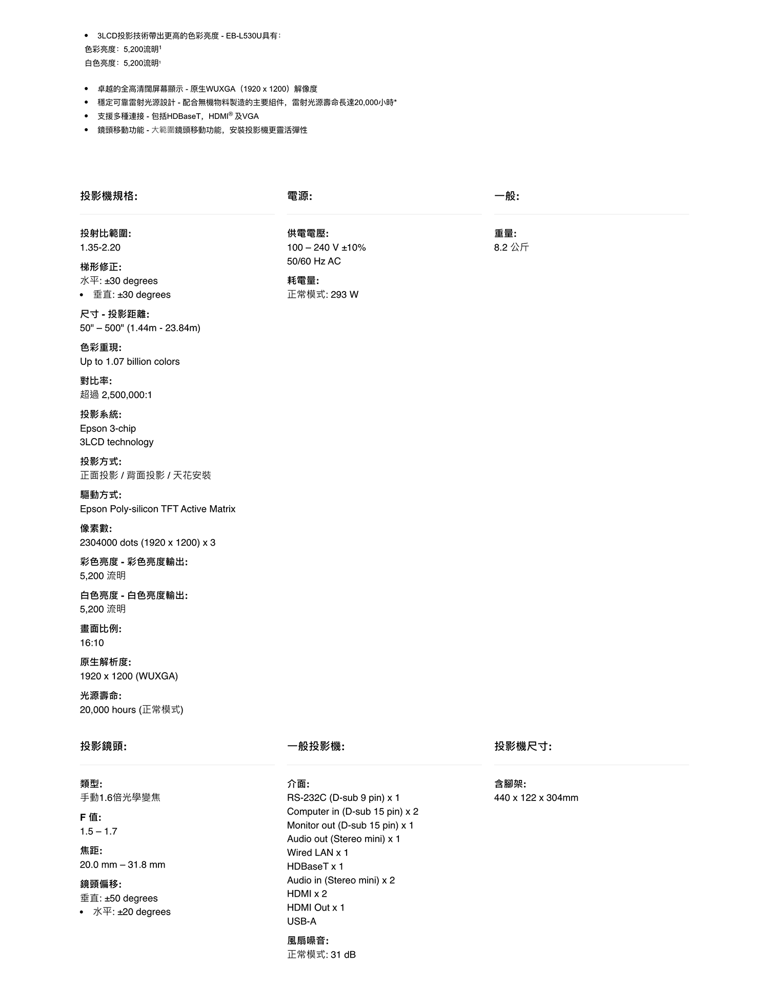Epson全新型號雷射投影機EB-L530U,適合不同會議室和教育機構使用。 雖然機身細小,但EB-L530U具有5200流明的色彩亮度1,全高清WUXGA解像度以及一系列出色的功能,包括4K影像輸入,HDBaseT和HDMI連接,屏幕鏡像和鏡頭移動功能。EB-L530U的雷射光源壽命長達20000小時*,使用更穩定安心。