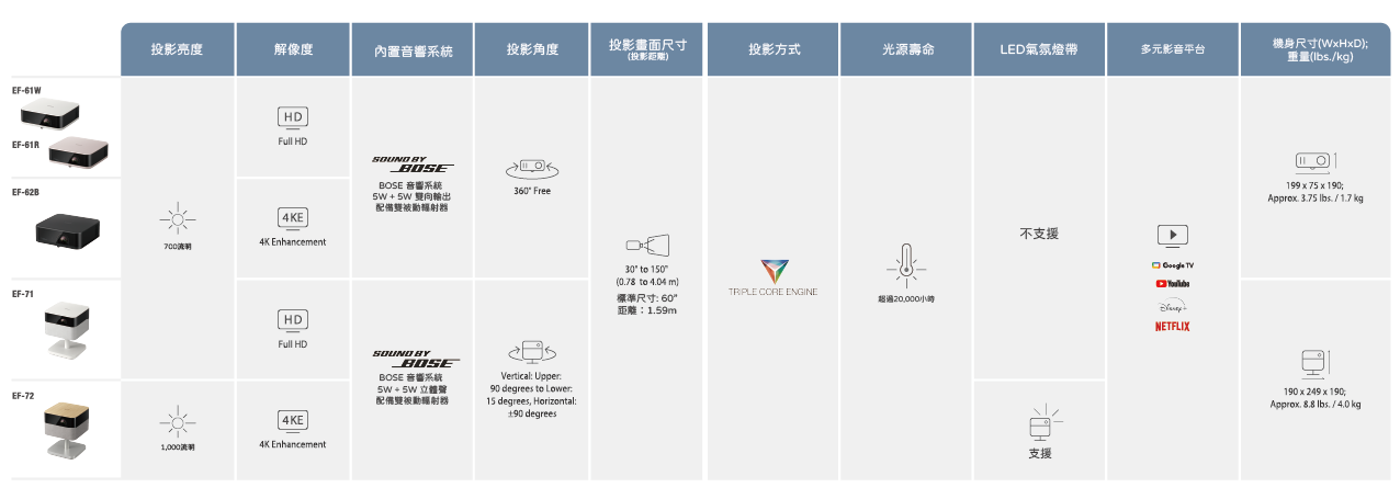 革新投影 - 3LCD x RGB-LED,3芯片技術,防彩虹效應,長時間觀看雙眼不易疲勞