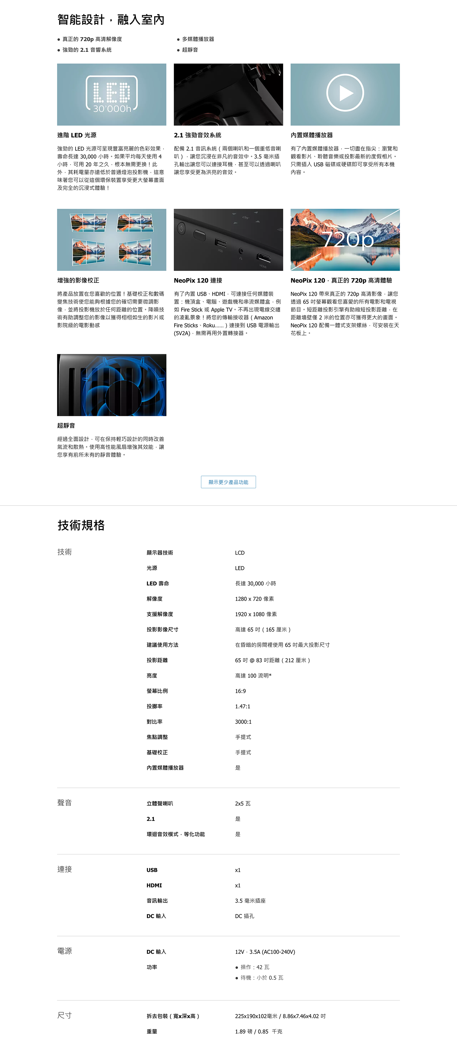 以 NeoPix 120 享受高達 65 吋的 720p 高清影像。設計小巧,提供多項連接器可供選擇(HDMI、USB)。內置的多媒體播放器可播放電影和圖片,配合 2.1 喇叭系統更可播放音樂。