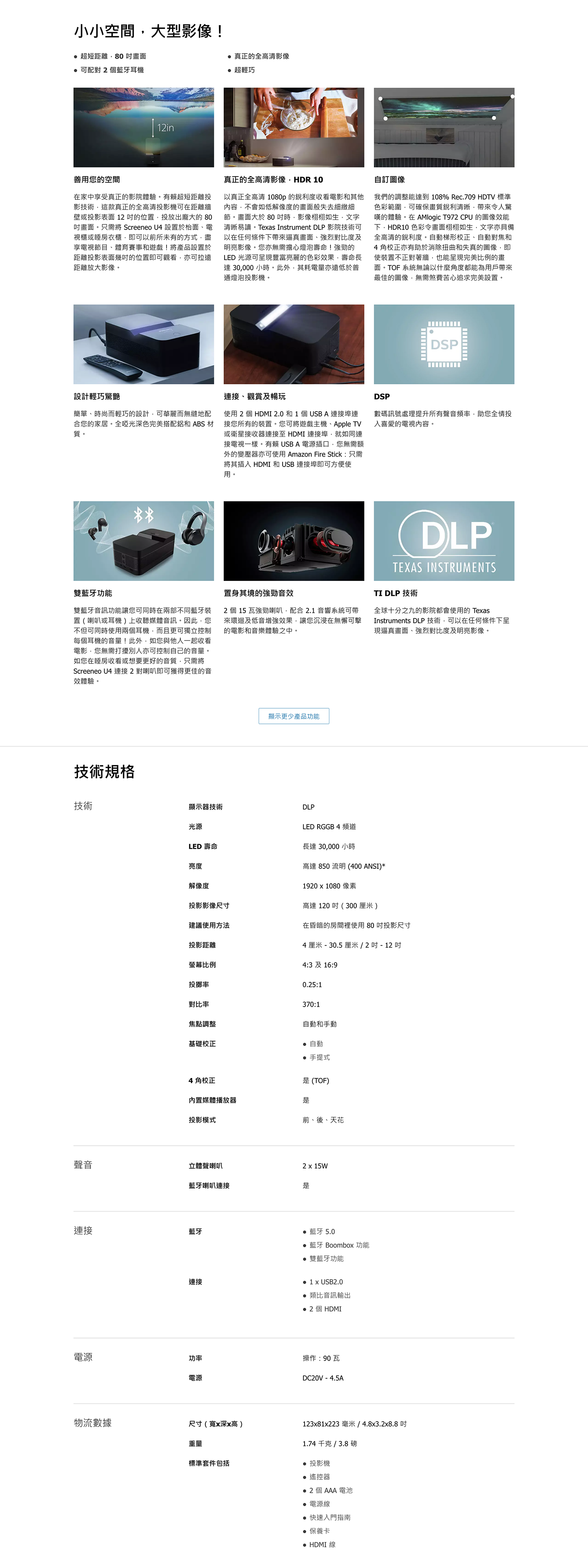 在距離牆壁幾吋的位置,超短距離投影機 Screeneo U4 可投射高達 120 吋的 HDR10 真正全高清解像度影像,而且具有雙藍牙功能,最多可連接 2 對喇叭/耳機。